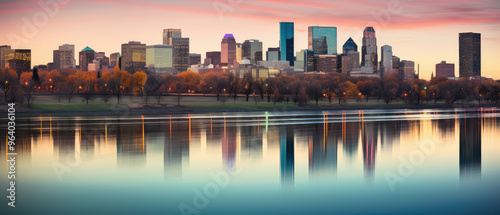 Fototapeta premium Tranquil City Skyline Reflected in Water at Sunset