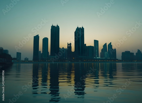 Fototapeta premium Tranquil cityscape at twilight, Silhouettes of towering skyscrapers mirrored...