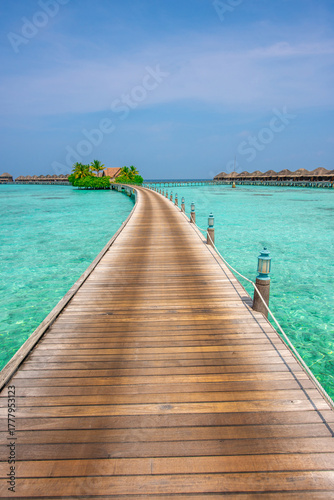 © Kyrenian, Obraz premium Tranquil closeup calm sea water waves with palm trees. Beautiful Panorama, Tropical island beach landscape exotic shore coast. Summer vacation, holiday amazing nature. Relax paradise, Maldives.