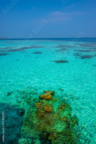 © Kyrenian, Fototapeta premium Tranquil closeup calm sea water waves with palm trees. Beautiful Panorama, Tropical island beach landscape exotic shore coast. Summer vacation, holiday amazing nature. Relax paradise, Maldives.