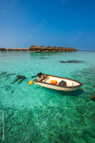 © Kyrenian, Fototapeta premium Tranquil closeup calm sea water waves with palm trees. Boat and bungalows background. Tropical island beach landscape exotic shore coast. Summer vacation, holiday amazing nature, Maldives.