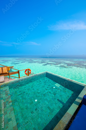 Fototapeta premium Tranquil closeup calm sea water waves with palm trees. Cabin with pool. Tropical island beach landscape exotic shore coast. Summer vacation, holiday amazing nature. Relax paradise, Maldives.