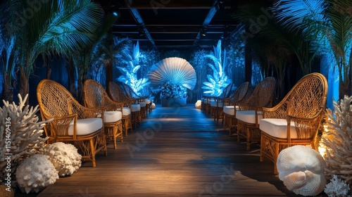 Naklejka premium Tranquil Coastal Catwalk: Serene T-shaped Setup with Bamboo Chairs, Seashells, and Soft Blue Lighting | Photorealistic Fashion Show Runway