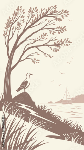 Fototapeta premium Tranquil coastal scene featuring a seagull tree and sailing boat on a...