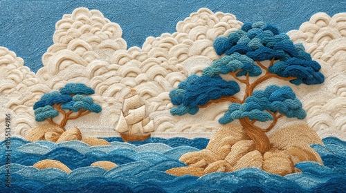 © 69, Naklejka premium Tranquil Coastal Scene Featuring Embroidered Trees, Sailing Ship, and Waves on Textured Fabric Background in Vibrant Colors