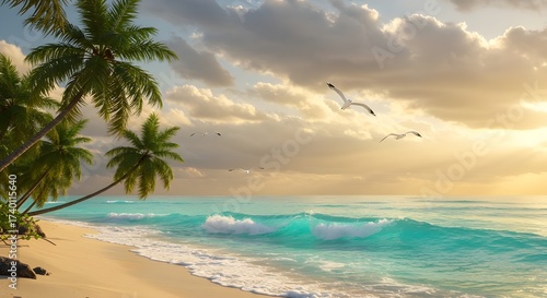 © Ashian, Fototapeta premium Tranquil Coastal Scene Featuring Soft Sand, Seagulls, and Golden Sky Glow