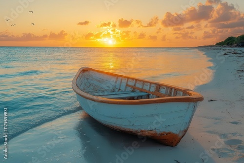 © julija, Fototapeta premium tranquil coastal scene with traditional wooden sailing paddle boat gently floating near sandy seashore during golden hour with seabirds flying
