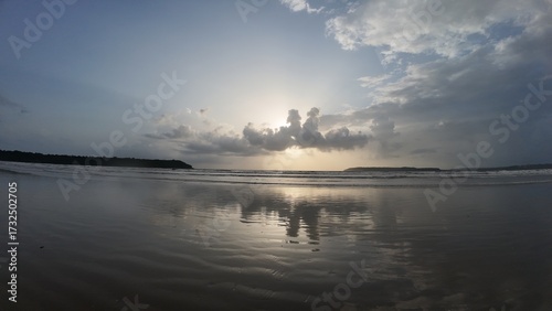 © sumit, Naklejka premium Tranquil Coastal Scenery: Rhythmic Movement of the Water and Symmetrical Reflections During the Golden Hour on a Broad, Flat Beach.