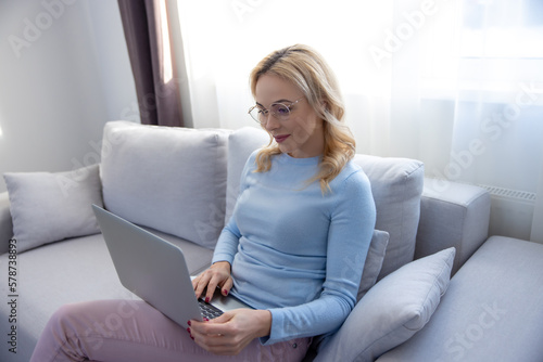 © zinkevych, Fototapeta premium Tranquil concentrated lady in eyeglasses typing on her laptop