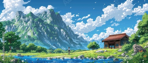© muhamad, Fototapeta premium Tranquil Cottage Nestled in a Lush Valley