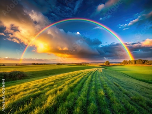 Naklejka premium Tranquil countryside sunset bathes a green field in low-light rainbow hues. Vibrant sky!