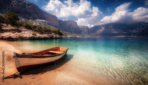 Fototapeta premium Tranquil cove, wooden boat on sandy beach, mountains backdrop