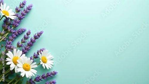 © GMeta, Naklejka premium Tranquil daisy and lavender banner on teal backdrop