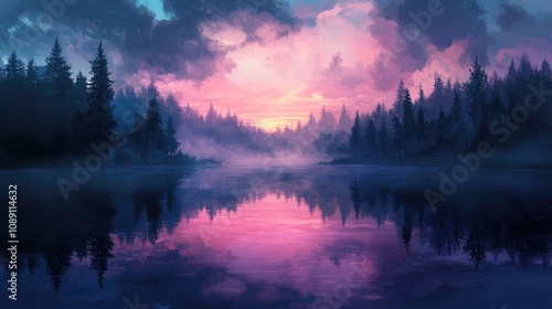 Fototapeta premium Tranquil dawn lake scene enveloped in mist with vibrant clouds and dark forests reflecting on still water, creating a picturesque natural landscape.