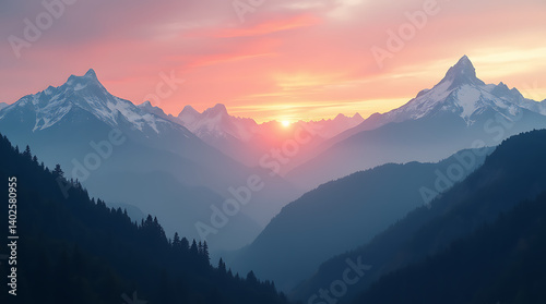 Obraz premium Tranquil Dawn Over Majestic Snowy Mountains and Verdant Forests, Bathed in...