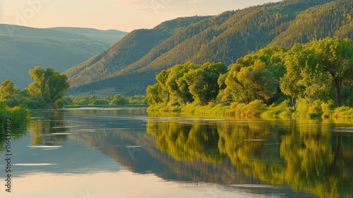 Fototapeta premium Tranquil dawn reflections on a calm mountain lake a serene nature...