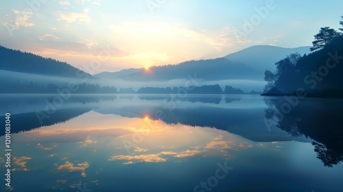 © iProDesign, Fototapeta premium tranquil dawn scene with mist over lake, reflecting mountains and sky