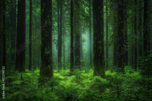 Fototapeta premium Tranquil Dense Forest with Lush Greenery and Soft Ambient Light