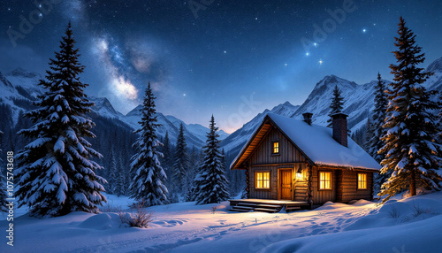 Fototapeta premium Tranquil desktop wallpaper of a snowy mountain cabin beneath a clear, starry...