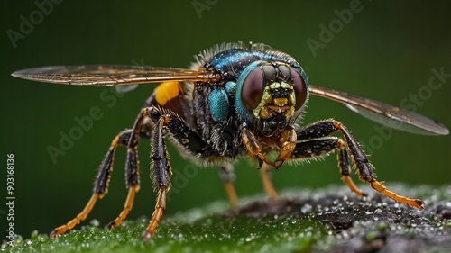 © Oleksandr, Fototapeta premium Tranquil dragonfly resting on a broad green leaf by a pond