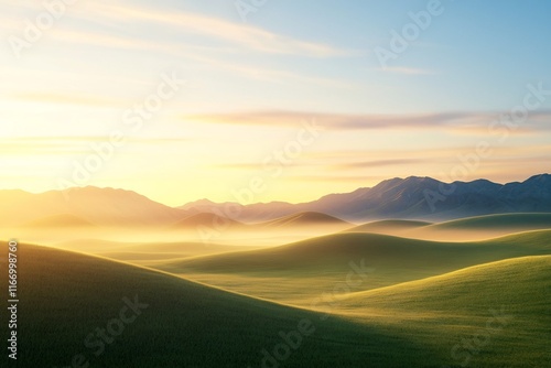 Fototapeta premium Tranquil Dusk Landscape with Rolling Hills and Distant Mountains Bathed in...