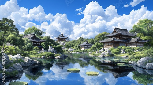 © ChalawanHunsa, Fototapeta premium Tranquil East Asian Garden Landscape Traditional Architecture Reflected in Calm Pond Under Blue Sky