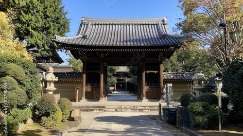 Fototapeta premium Tranquil entrance to a historic temple surrounded by lush greenery on a sunny...