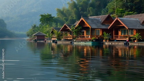 Naklejka premium Tranquil Floating Bungalows Amid Serene Lake Landscapes in Tropical Thailand