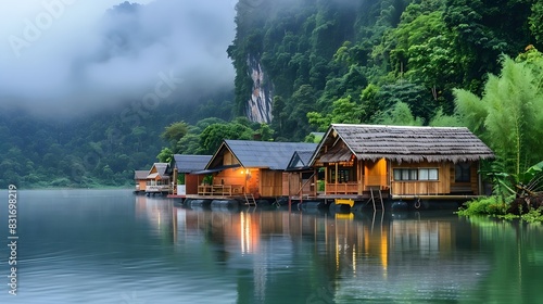 © Ratchadaporn, Naklejka premium Tranquil Floating Bungalows on a Misty Mountain Lake in Kanchanaburi Thailand
