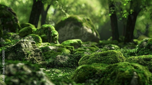 Obraz premium Tranquil forest backdrop with moss-covered stones, showcasing the serene...