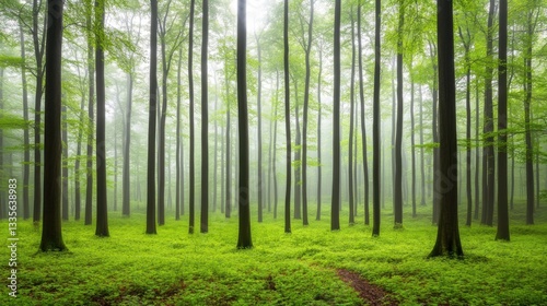 Obraz premium Tranquil forest bathed in soft sunlight, earthy tones blending harmoniously, evoking peace and natural serenity.