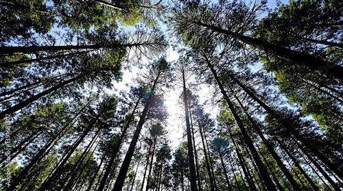 © Sk siam, Fototapeta premium Tranquil Forest Canopy View with Sunlight Streaming Through Tall Trees
