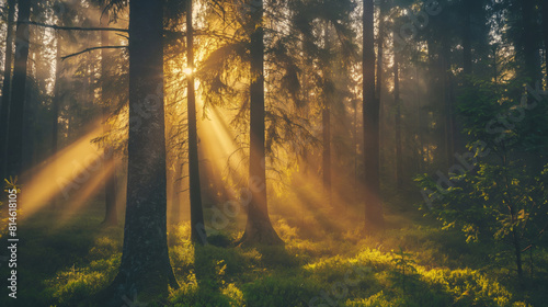 Fototapeta premium Tranquil forest clearing bathed in warm sunlight filtering through the trees