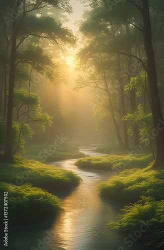 © Koto, Obraz premium Tranquil forest creek with morning sunlight and soft mist