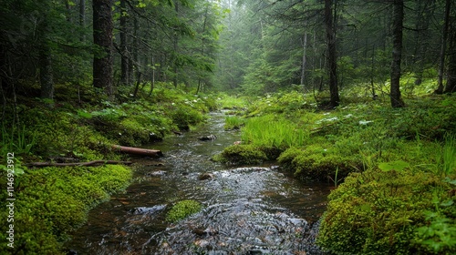 Fototapeta premium Tranquil Forest Ecosystem with Stream and Lush Greenery Illustrating Natural...