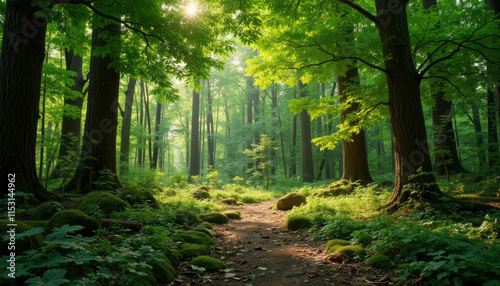 Obraz premium Tranquil forest floor texture with dappled sunlight filtering through leaves,...