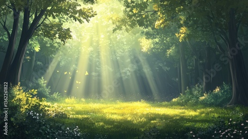 © Johannes, Obraz premium Tranquil forest glade bathed in morning sunlight illustration