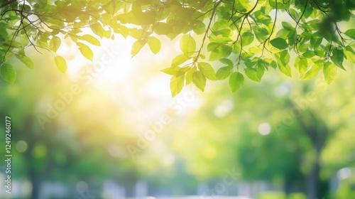 © Lexie, Obraz premium Tranquil Forest Glow with Soft Sunlight and Warm Tones, Perfect for Text Placement