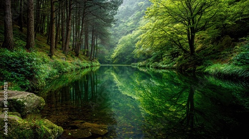 © bejo, Obraz premium Tranquil forest lake mirrors lush green trees and dense woods.