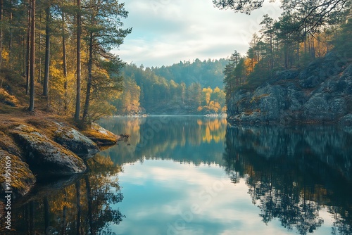 Naklejka premium Tranquil Forest Lake with Misty Morning Atmosphere, Nature Photography