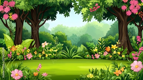 © Anusa, Fototapeta premium Tranquil Forest Landscape with Lush Foliage and Blooming Flowers for Backdrop or Text