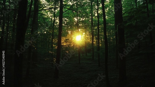 © Photock Agency, Obraz premium Tranquil Forest Path at Sunset in a Lush Green Woodland