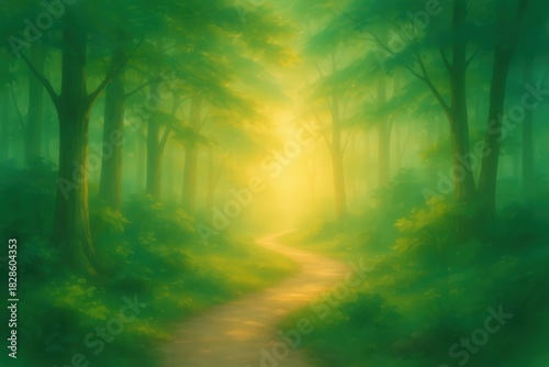 Obraz premium Tranquil Forest Path Illuminated by Soft Sunlight Inviting Serenity and...