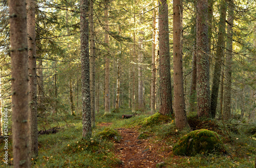 Obraz premium Tranquil forest path meandering through moss-covered ground and towering trees bathed in golden sunlight