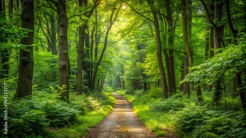 © Ole Studio, Fototapeta premium Tranquil forest path surrounded by dense green foliage in daylight
