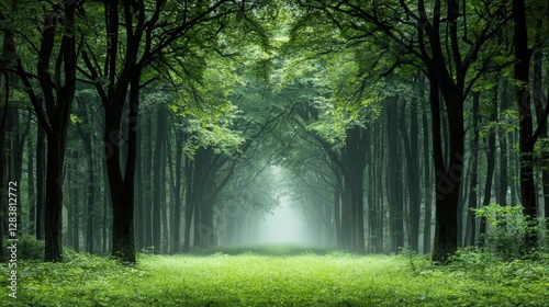 © 69, Fototapeta premium Tranquil Forest Path Surrounded by Lush Green Trees and Misty Atmosphere Ideal for Nature Lovers and Outdoor Enthusiasts
