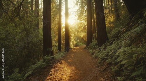 © Jelena, Fototapeta premium Tranquil Forest Path Surrounded by Majestic Trees at Golden Hour