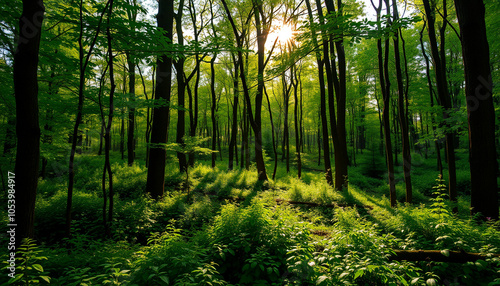 Obraz premium Tranquil forest path with sunbeams through trees