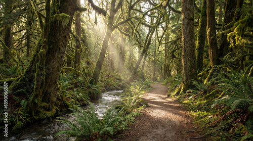 © Elenba, Fototapeta premium Tranquil forest path with sunlight filtering through trees casting shadows over trail. Scenic forest setting includes lush greenery, flowing stream, and soft earth beneath feet.