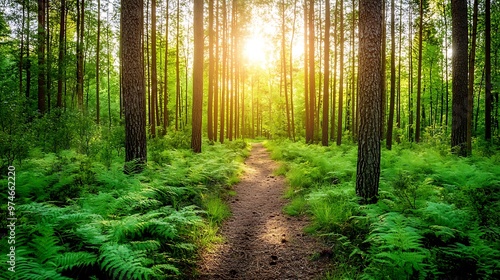 © aironamad, Obraz premium Tranquil Forest Pathway Bathed in Gentle Light Surrounded by Lush Greenery